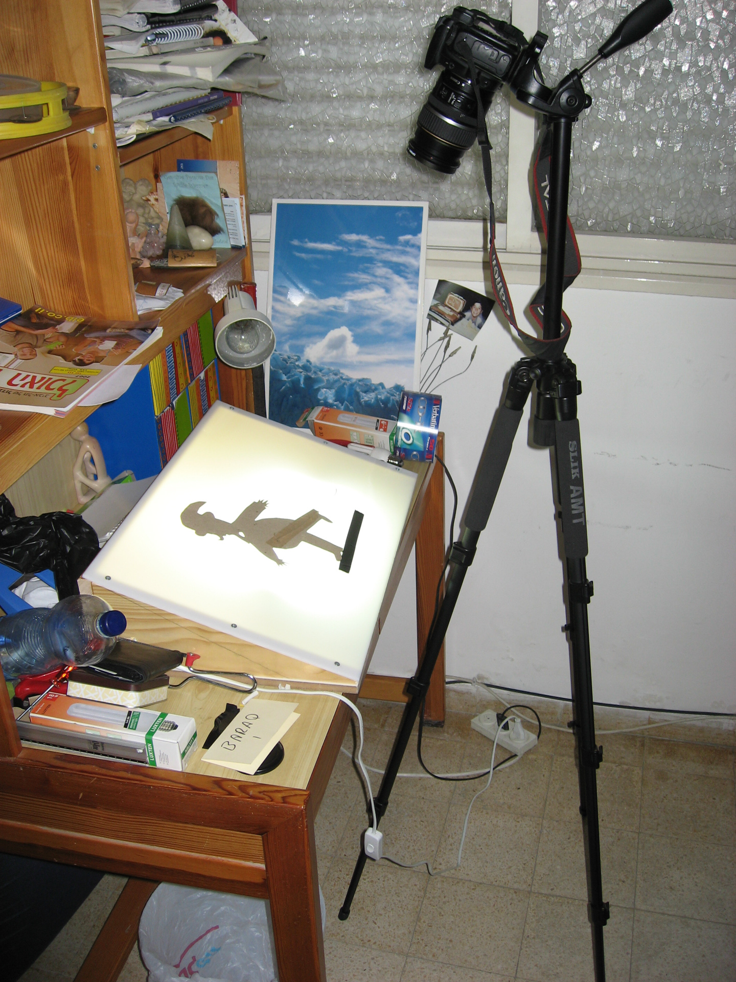 השלב הראשון היה לסרוק את הדמויות למחשב. מצאתי ברשת תרשים לבנייה של שולחן אור. את הדמויות תכננתי להניח על שולחן האור ולצלם. קניתי לוח פרספקס, מצאתי שאריות עץ ליד הבית בשד' נורדאו, ונגר ניסר אותן לגדלים הנכונים. קצת חשמל, ברגים ו-voila, היה שולחן אור. חצובה נורמאלית רציתי כבר מזמן, רק חיכיתי לתירוץ... קניתי והתחלתי לצלם.