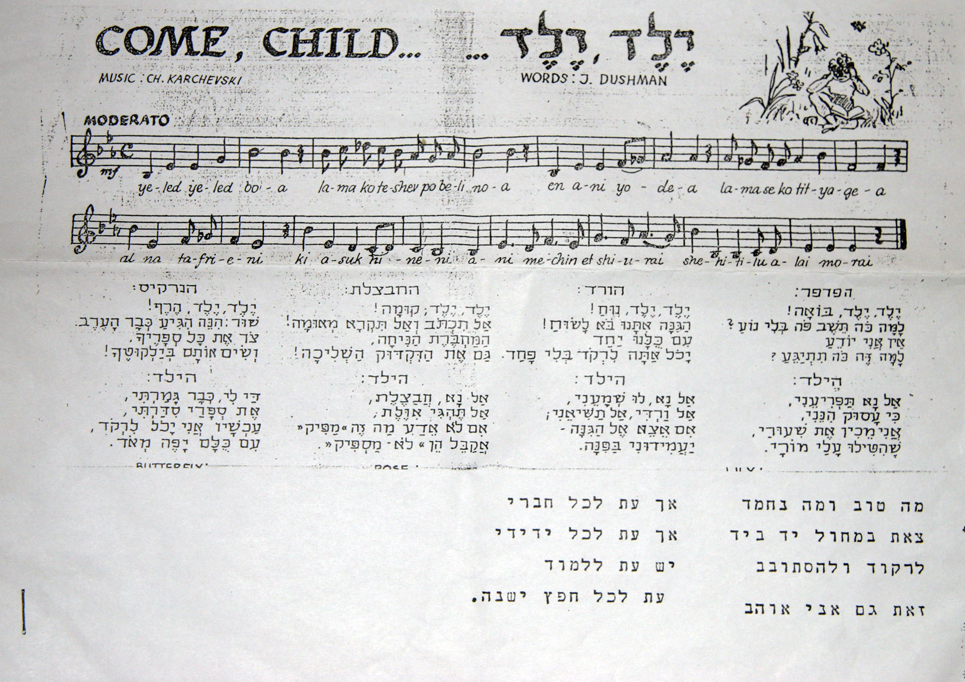 אמא נראית כתמיד כאמנית צעירה שבאה הדורה בלבושה, עם כל האופטימיות והרצינות שאיפיינה אותה בעת הצגת הצלליות. עמדתי מהצד והצטרפתי לשירת נעימות "הילד החרוץ" ביחד עם אבא. אמא ואנחנו הפעלנו, מבלי להידבר, כוח פנימי רב להתגבר על אפסות התגובה. ברור היה למציגי הצלליות ולאחריהן, שקופיות הפריחה של האביב שצריך להישאר אופטימי ולחייך על "הבמה". אם היתה מחיאת כפיים אחת או שתיים, היה זה מצד חנה מארגנת הבילוי של האנשים והנשים שבאחריותה.